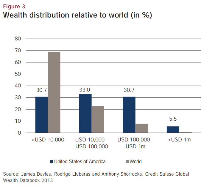 Remember, this is world wealth inequality, not US wealth inequality. What does US wealth look like? According to page 46 of the Credit Suisse report, 40% of US adults are in the top decile of wealth distribution. Heck, 7.5% of US adults are in the top 1% of wealth owners worldwide. There's a graph of US wealth distribution compared to the world.[4] It shows the US as a much more balanced place.